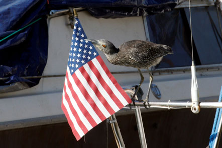 The last day of our trip had us breaking into smaller groups, since some of us had to get back to the Bay Area for work the next day, but most of us were able to fit in a stop at Morro Bay to see the two Yellow-crowned Night-Herons that have been hanging out at the State Park Marina. Both of the young herons were perched on boats and gave us great views for this difficult ID challenge. The shorter, thicker bill on the Yellow-crowned Night-Heron is also all-dark and there are some subtle plumage differences, as well. These cooperative birds gave us a lesson in identification, along with some great entertainment, when one of them started playing with the American Flag on the boat's stern.